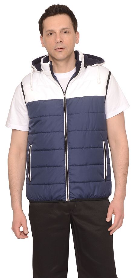 Жилет утепленный, стеганный, на подкладке, прямого силуэта, с воротником стойка, с центральной бортовой застежкой на тесьму - "молния", с прорезными карманами на тесьму - "молния", с внутренним карманом застегивающийся на текстильную застежку - "липучку". Капюшон с подкладкой из ткани флис, пристегивается в горловину жилета на тесьму - "молнию"; объем регулируется при помощи шнура.