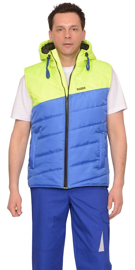 Жилет стеганный, полуприлегающего силуэта, с центральной бортовой застёжкой на тесьму-"молния" с капюшоном, с нижними прорезными карманами в "листочку", с внутренним карманом застёгивающийся на "липучку".
