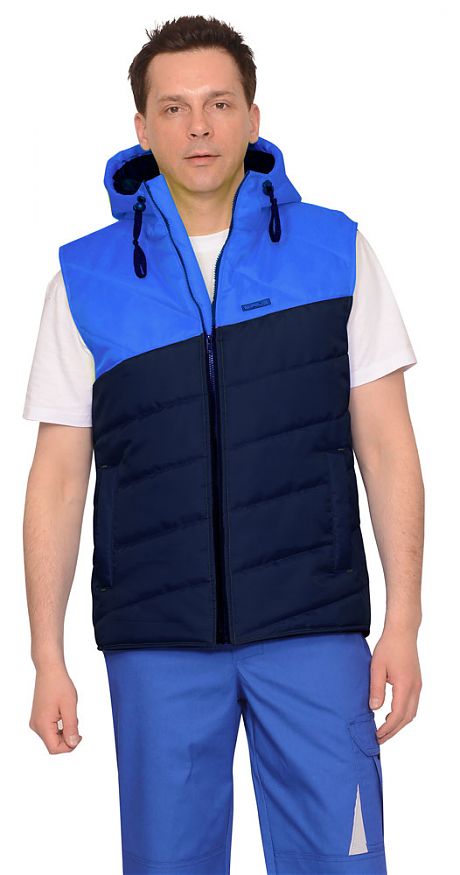 Жилет стеганный, полуприлегающего силуэта, с центральной бортовой застёжкой на тесьму-"молния" с капюшоном, с нижними прорезными карманами в "листочку", с внутренним карманом застёгивающийся на "липучку".