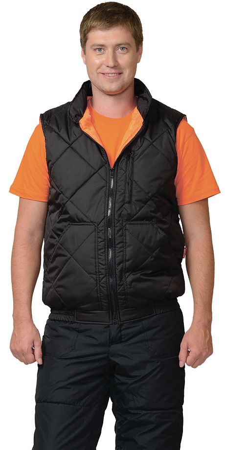 Жилет утепленный стеганный, на подкладке, прямой с углубленными проймами, с центральной бортовой застежкой на тесьму - «молния», воротником - «стойка», верхним прорезным карманом на «молнии» и нижними утепл.нными стеганными накладными карманами. Пояс притачной, с эластичной лентой.