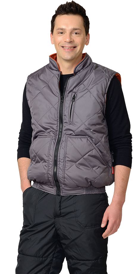 Ткань верха: "Дюспа"; с ВО пропиткой; состав: 100% п/э; поверхностная плотность 137 г/м; . Ткань подкладочная: "Флис"; состав: 100 % - п/э.; ширина 150 см.; Утеплитель: "Синтепон" поверхностная плотность 150 г/м.Жилет стёганный, на подкладке, прямой с углубленными проймами, с центральной бортовой застёжкой на тесьму - "молния", воротником - "стойка", верхним прорезным карманом на "молнии" и нижними утеплёнными стёганными накладными карманами. Пояс притачной, с эластичной лентой