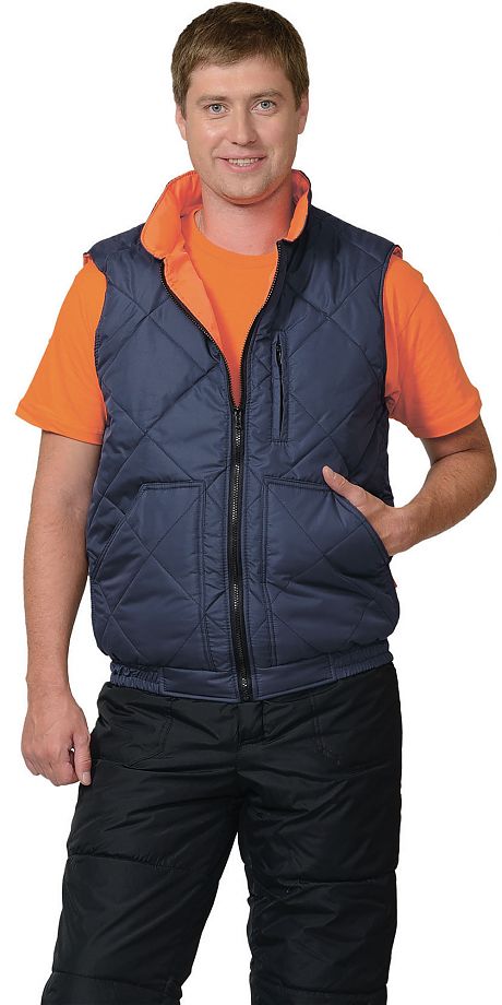 Жилет стёганный, на подкладке, прямой с углубленными проймами, с центральной бортовой застёжкой на тесьму - "молния", воротником - "стойка", верхним прорезным карманом на "молнии" и нижними утеплёнными стёганными накладными карманами. Пояс притачной, с эластичной лентой.