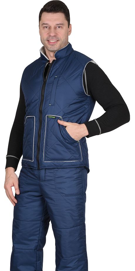 Жилет стёганный, на флисе, с центральной бортовой застёжкой на тесьму - "молния", воротником - "стойка", верхним прорезным карманом на "молнии" и нижними утеплёнными стёганными накладными карманами с перекантом по всем сторонам из ткани флис.