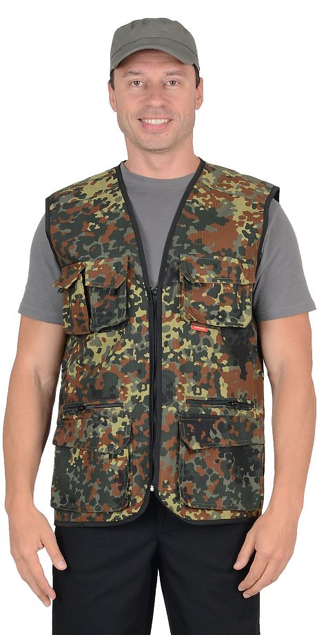 Жилет с V- образным вырезом горловины, с настроченными и отрезной кокетками, с центральной застежкой на тесьму - «молния», с накладными фигурными верхними карманами и фигурными клапанами застегивающиеся на потайную липучку, с горизонтальными карманами в рамку на тесьму - «молния»,с нижними фигурными карманами и фигурными клапанами застегивающимися на потайную липучку.
