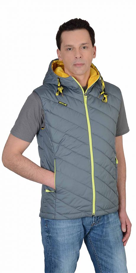 Жилет утепленный прямого силуэта, с притачным капюшоном, с центральной застежкой на тесьму «молния», полочка с двумя нижними карманами в рельефах на «молнии», все детали жилета простеганы, с внутренней стороны на левой полочке расположен накладной карман на молнии, спинка удлиненная.