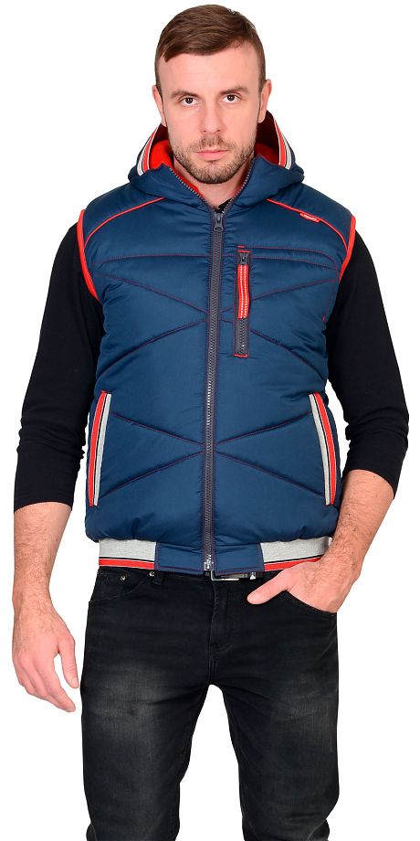 Жилет утепленный, с притачным капюшоном, с центральной застежкой на тесьму-"молния", полочка с двумя нижними и одним верхним карманами. Верхний карман с вертикальным входом на "молнии", нижние карманы с листочкой из декоративной резинки. Пояс притачной на резинке.Ткань верха: "Дюспо", состав: 100% п/э, пл. 75 г/ м2Ткань подкладочная: "Флис", 100% п/э, пл. 180 г/м2 Ткань подкладочная2: "Тафета", состав: 100 п/э. пл.75 г/м2, Утеплитель: "Синтепон", состав: 100%п/э, пл. 150 г/м2.Спинка, полочка - 300 г/м2 (2 слоя).Нижняя часть капюшона - 150 г/м2 (1 слой).