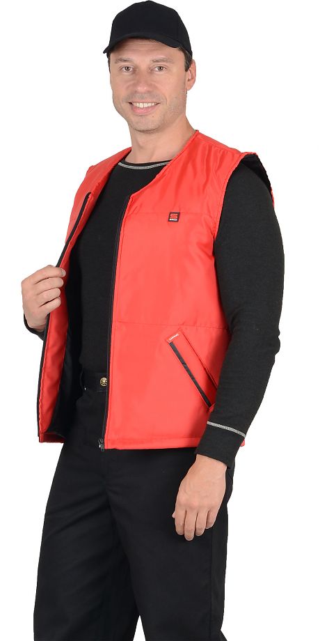 • тк. Оксфорд-100%-п/э, утеплитель-синтепон. Жилет прямого силуэта, с притачной утепленной подкладкой, с центральной застежкой на тесьму - «молния», с V-образным вырезом горловины, с прорезными карманами с «листочкой» с втачными концами, с наклонным входом.