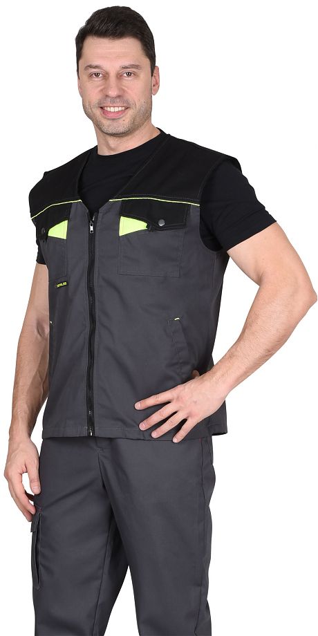 Жилет с подкладкой из сетки, на сетке выполнен карман на «молнии», с центральной застёжкой на тесьму - молния, с V- образным вырезом горловины, с отрезными цветными кокетками, с накладными верхними карманами и фигурными клапанами застегивающиеся на кнопку, с нижними прорезными карманами в «листочку»