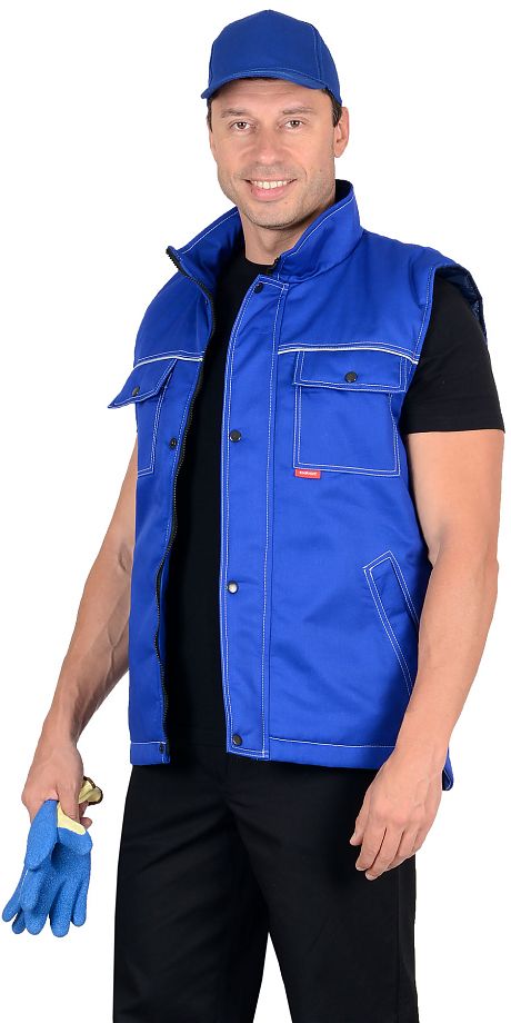 Жилет утепленный прямого силуэта, с центральной застежкой на тесьму "молния" до верха; с ветрозащитной планкой, с накладными верхними карманами с клапанами и прорезными нижними карманами с листочкой.Ткань: смесовая, пл. 210г/м2, состав: 65% п/э, 35% х/б. Ткань подкладочная: "Таффета", состав: 100% п/э.Утеплитель: "Синтепон", 1 слоя - итого 120 г/м2.ГОСТ 25295-2003