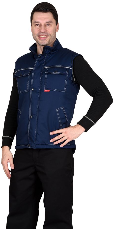 Жилет утепленный прямого силуэта, с центральной застежкой на тесьму "молния" до верха, с ветрозащитной планкой, с накладными верхними карманами с клапанами и прорезными нижними карманами с листочкой.Ткань: смесовая, пл. 210 г/м?, состав: 65% п/э, 35% х/б. Ткань подкладочная: "Таффета", состав: 100% п/э.Утеплитель: "Синтепон", 2 слоя - итого 240 г/м2.ГОСТ 25295-2003