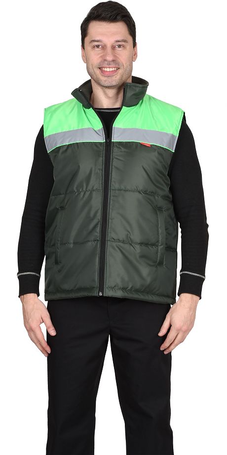 Жилет прямого силуэта, утеплённый, с притачной подкладкой, с центральной застёжкой на тесьму - "молния", с воротником стойка, с прорезными карманами с "листочкой", с наклонным входом. ГОСТ 25295-2003