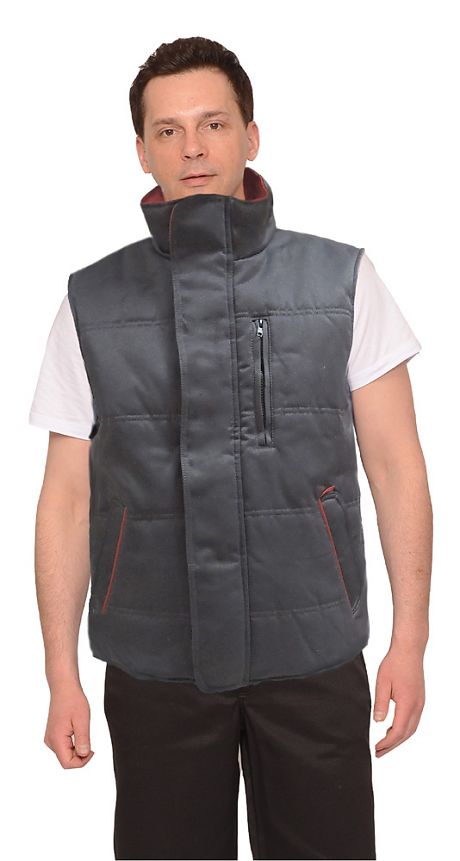 Жилет прямого силуэта утепленный с застежкой на молнию, с планкой. Воротник – стойка. Полочки с двумя нижними прорезными карманами. Внутренний накладной карман. Спинка удлинена.