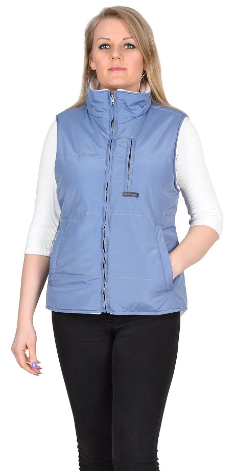 Жилет женский утепленный, стеганный, на подкладке из ткани флис, полуприлигающего силуэта, с воротником стойка, с центральной бортовой застежкой на тесьму- "молния", с проезными карманами "листочка", с верхним прорезным карманом.