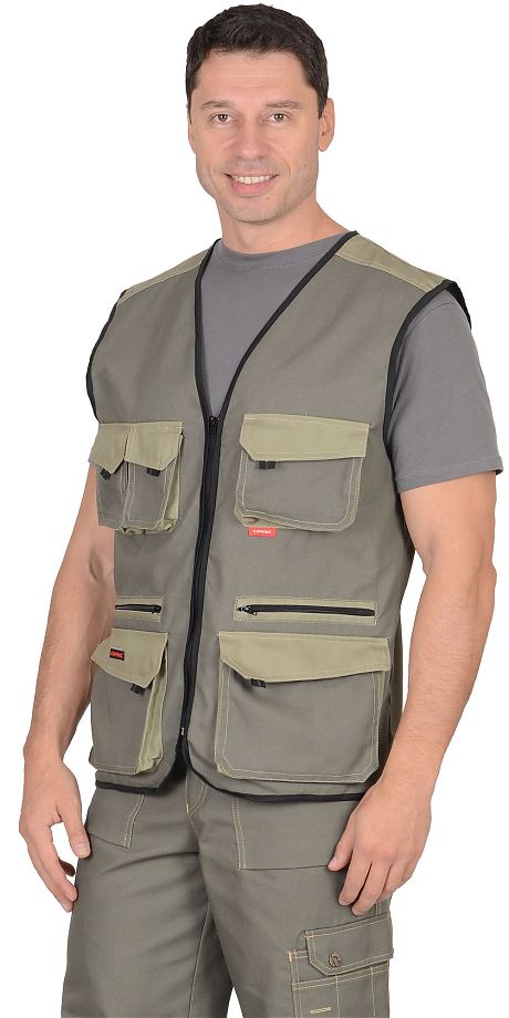 Жилет с V- образным вырезом горловины, с отрезными цветными кокетками, с центральной застежкой на тесьму - «молния», с накладными фигурными верхними карманами и фигурными клапанами застегивающиеся на потайную липучку, с горизонтальными карманами в рамку на тесьму - «молния»,с нижними фигурными карманами и фигурными клапанами застегивающиеся на потайную липучку.