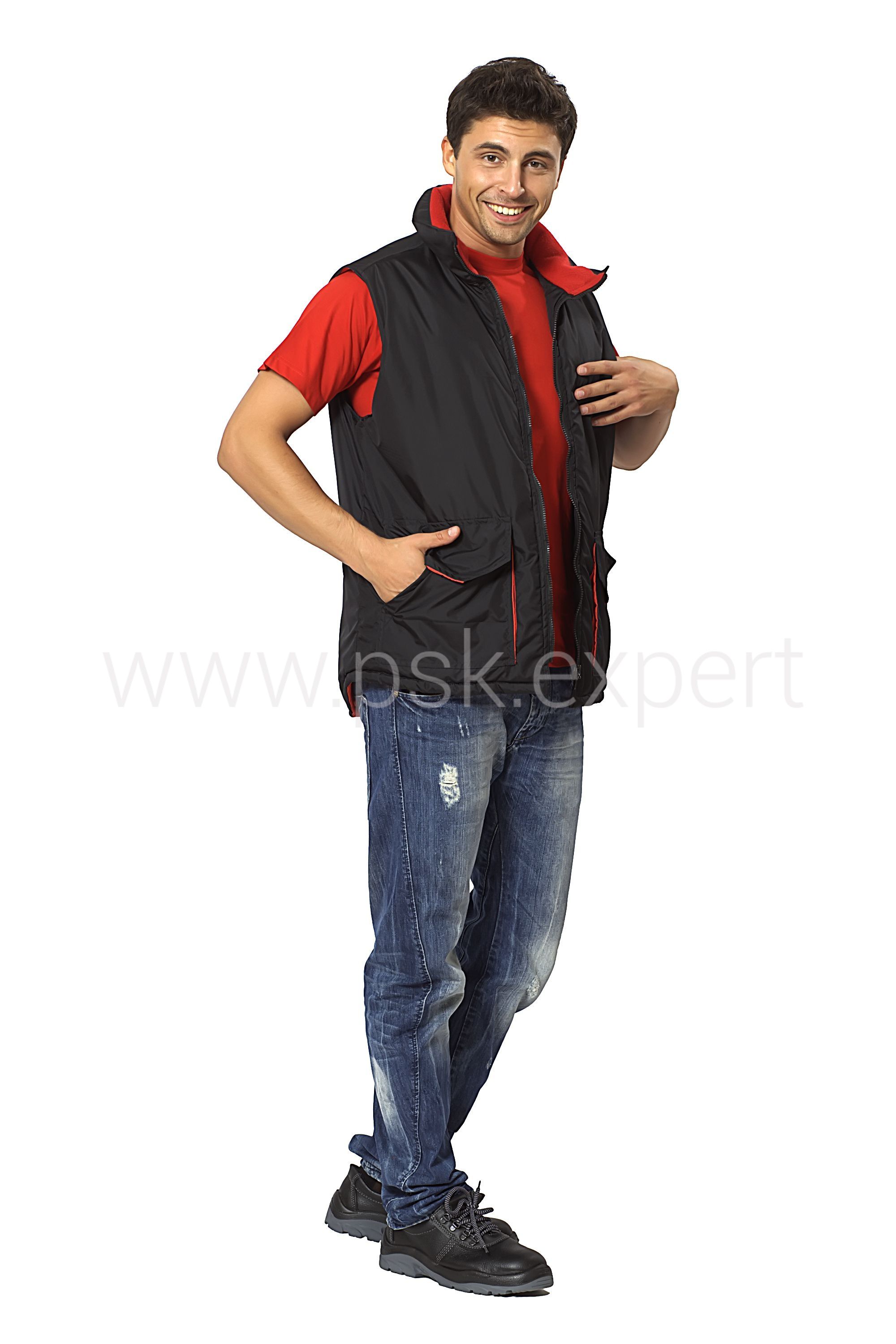 Жилет удобный, легкий, утепленный с центральной застежкой на молнию. На полочках объемные накладные карманы с клапанами. Отделка из контрастной ткани. Воротник для комфорта утеплен флисом.